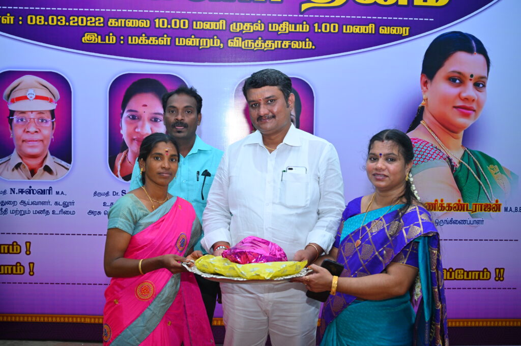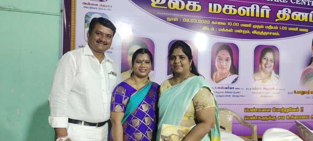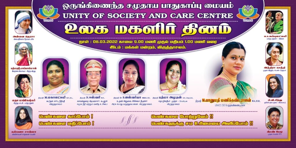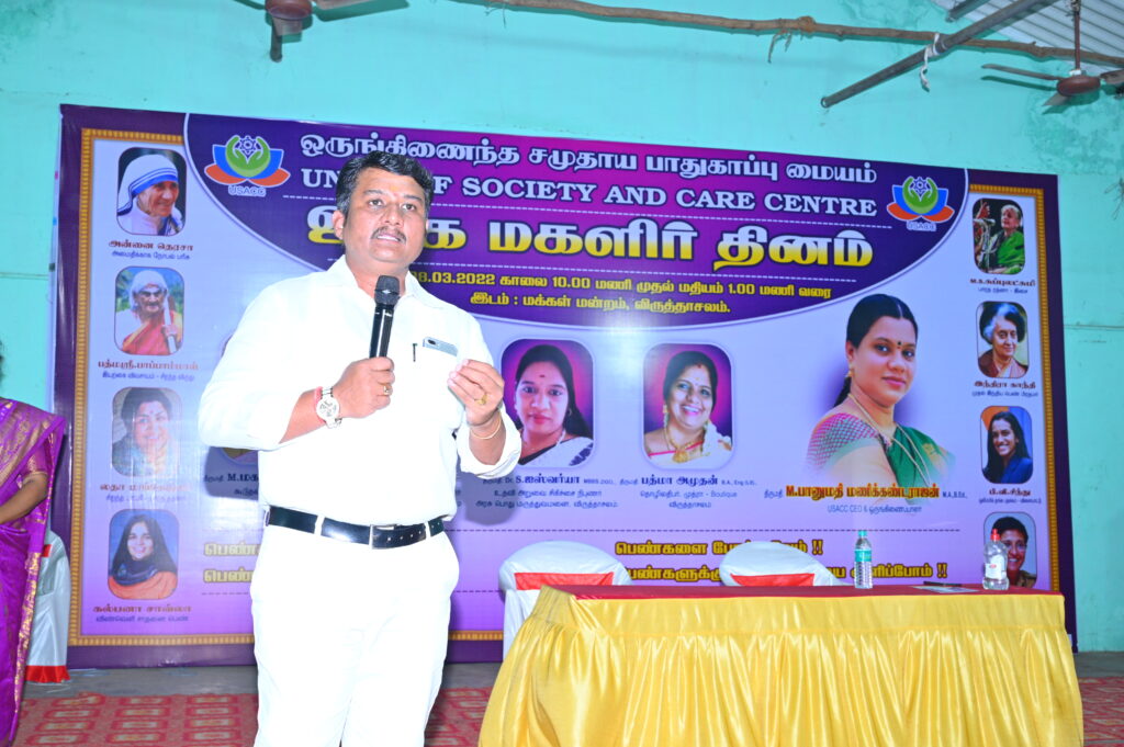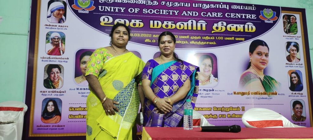 “மார்ச் 8, 2022, அன்று உலக மகளிர் தினத்தை முன்னிட்டு ஒருங்கிணைந்த சமுதாய பாதுகாப்பு மையம் (USACC) மற்றும் BS SMART கல்வி மையம் இணைந்தது இந்த மகளிர் தினத்தை கிராமப்புற பெண்கள் ,மகாலட்சுமி கூடுதல் சார்பு நீதிபதி விருத்தாசலம் ,ஈஸ்வரி காவல்த்துறை ஆய்வாளர் கடலூர் சமூக நீதி மற்றும் மனித உரிமை ,ஜஸ்வர்யா உதவி அறுவை சிகிச்சை நிபுணர் அரசு பொது மருத்துவமனை விருத்தாசலம் , பத்மா அமுதன் தொழியாதிபர், இவர்கள் உடன் கொண்டப்பட்டது இந்நிகழ்ச்சியில் தலைமை நிர்வாக அதிகாரி திருமதி பானுமதி மணிகண்டராஜன் அவர்கள் தலைமை தாங்கினார் மேலும்